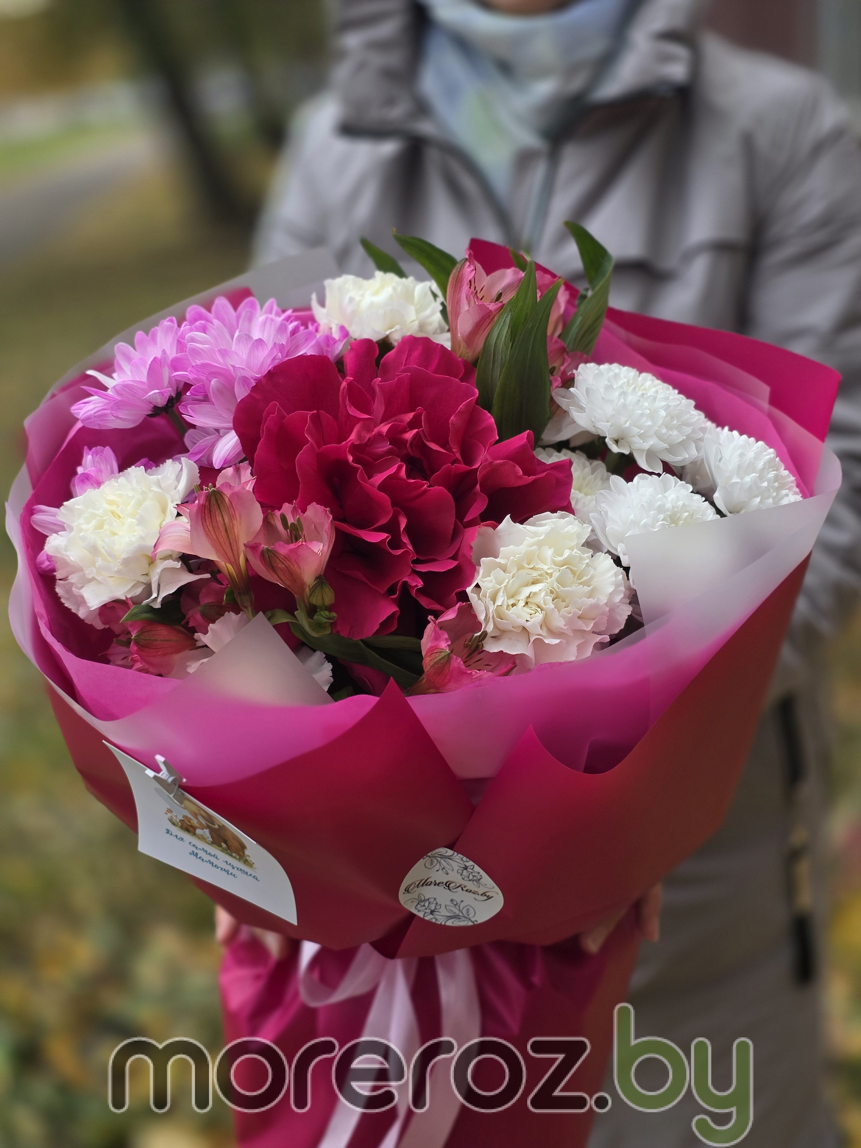 Букет «Фуксия» состоит из хризантем, роз, альстромерий и диантусов