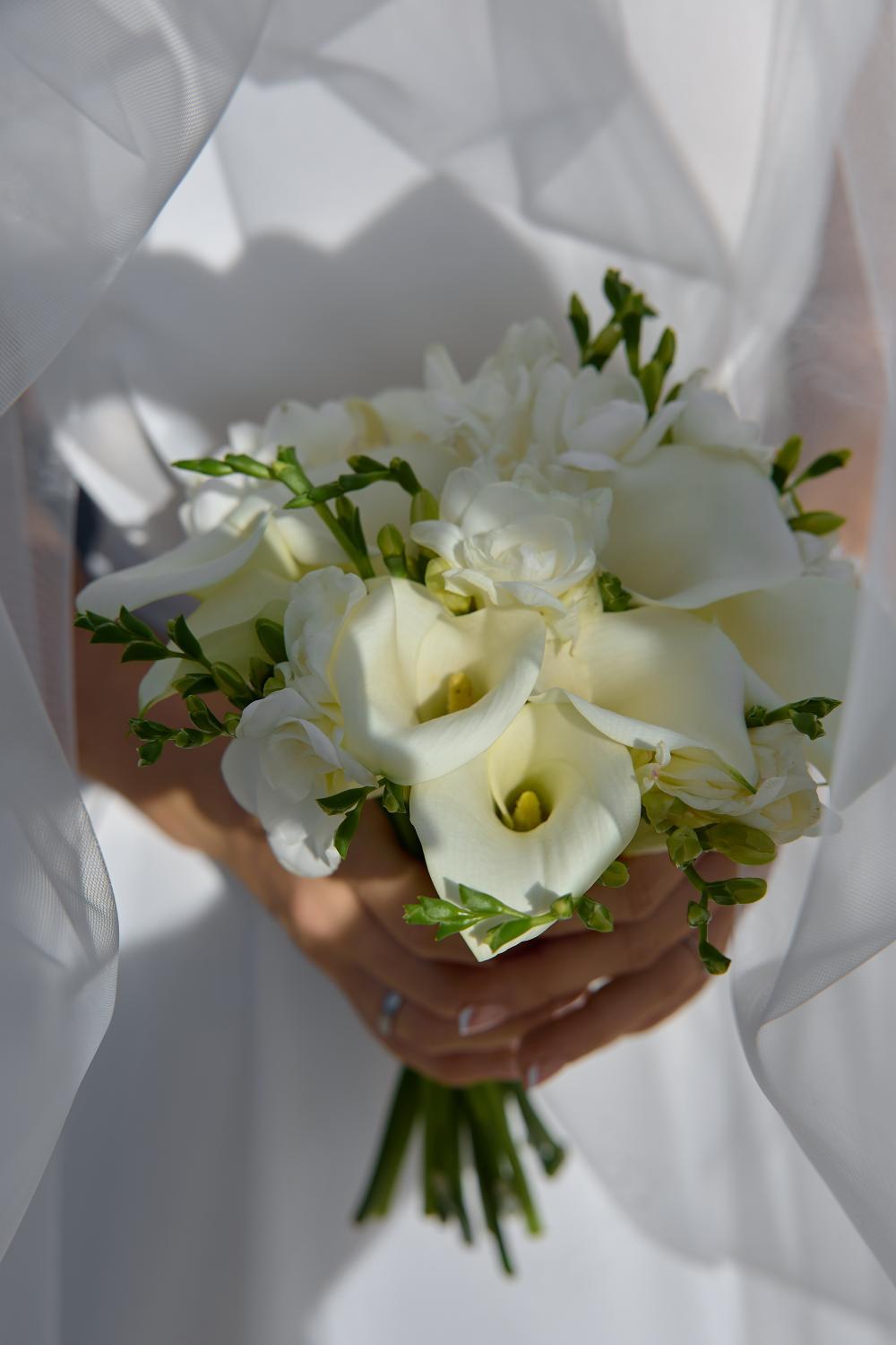 Каллы — символ счастья, уважения и семейного благополучия. Эти цветы также ассоциируются с восхищением и красотой. Нежные ароматные фрезии придают букету легкость и воздушность.