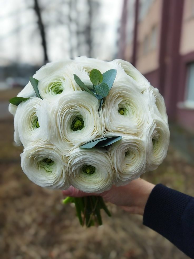 Ранункулюсы или лютики похожи на розы или маленькие пионы. В букете невесты они смотрятся очень романтично и аристократично. А эвкалипт придаёт композиции еще большую легкость и воздушность.