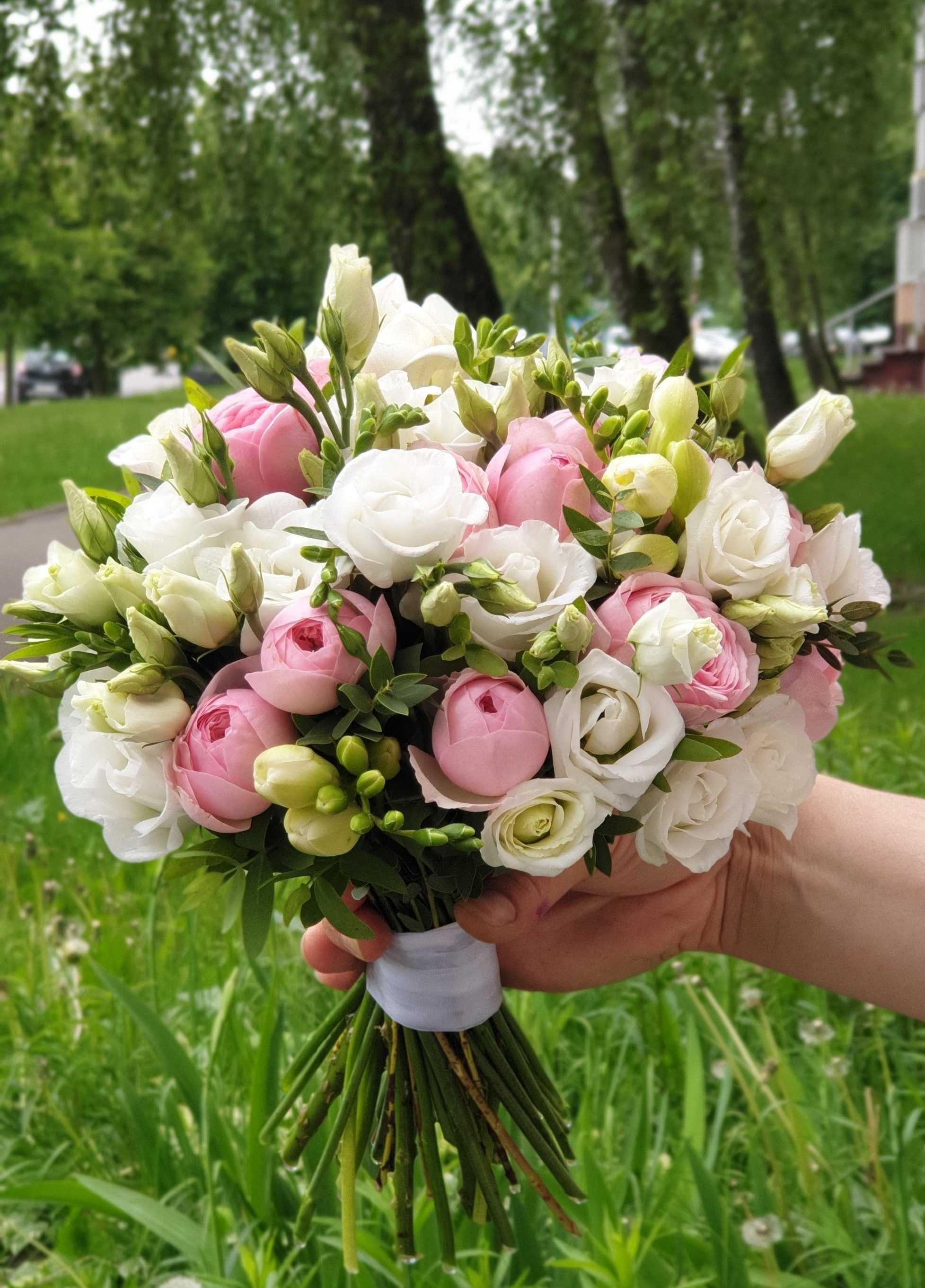 Букет невесты «Нежность утра» в розово-белых тонах с ароматными фрезиями, пионовидными розами и веточками эвкалипта.